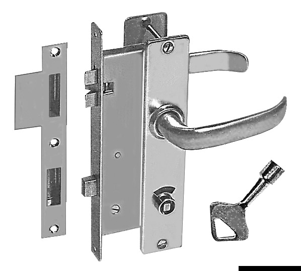 Антивибрационный врезной замок с внутренней блокировкой размером 212x22 мм предназначен для туалетных комнат. Выполнен из хромированной латуни, имеет стандартное отверстие под ручку и ключ для наружной разблокировки.