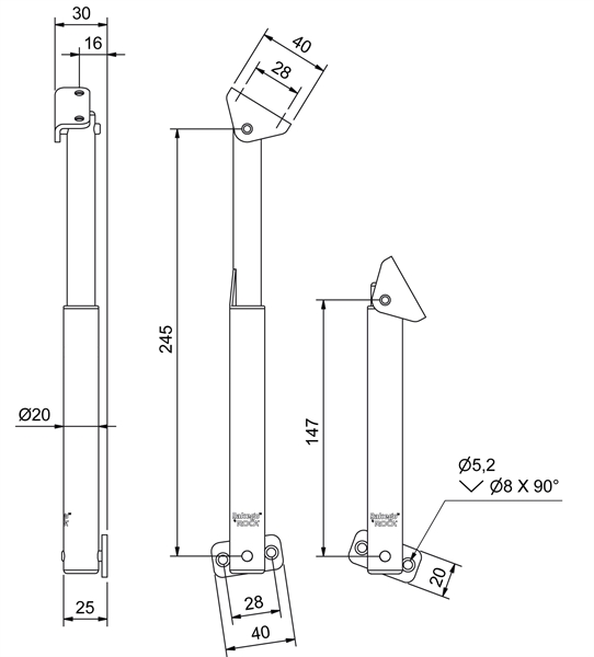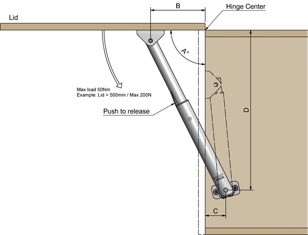 Механизм открывается простым нажатием кнопки и рассчитан на нагрузку до 50 Нм. Устройство подходит как для горизонтальных, так и для вертикальных крышек, а также может устанавливаться с любой стороны.