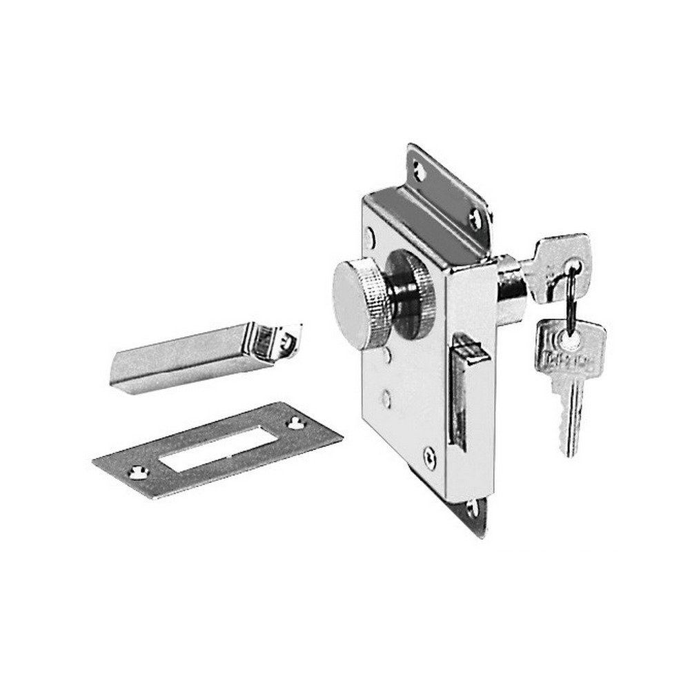 Дверной накладной замок из хромированной латуни размером 98x58 мм, левосторонний. Снабжен цилиндрическим ключом снаружи и внутренней ручкой. Практичный замок, подходит для дверей, оснащен фиксатором.