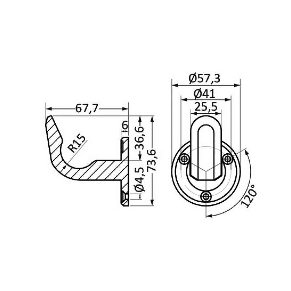Osculati 38.301.15 – усиленный крючок из нержавеющей стали AISI 316 с потайными винтами, 73.6×67.7 мм, 120°
