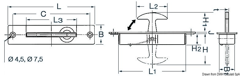 Откидная подпружиненная ручка заподлицо для подъема щитов пайола из нержавеющей стали. Товар по каталогу Оскулати: Откидная подпружиненная ручка заподлицо для подъема щитов пайола из нержавеющей стали для яхт и катеров.