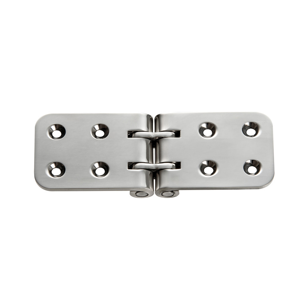 Петля из нержавеющей стали для столешницы размером 110x40x3 мм с углом открытия 180°. Сверхточная петля Osculati 38.291.00 предназначена для столешницы и обладает углом открытия в 180°. Изготовлена из нержавеющей стали AISI 316L и отполирована до зеркального блеска. Крепится на торец столешницы (минимальная толщина 19 мм). Конструкция петли обеспечивает минимальный люфт для надежной фиксации откидной секции. Размеры: 110x40x3 мм.