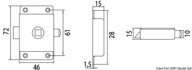 Замок для туалетных комнат с блокирующим рычажком размером 72x46 мм. Изготовлен из хромированной латуни. Все компоненты выполнены из материалов, устойчивых к коррозии.