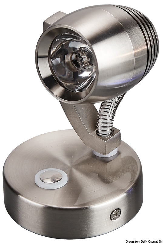 Точечный светодиодный светильник Osculati белый/синий свет IP20 - изготовлен из хромированного алюминия и оснащен сенсорным выключателем с диммером. Выключатель имеет три положения: 1 - светильник выключен, 2 - синий светодиод по периметру выключателя светит в качестве дежурного освещения, 3 - включен точечный светильник. Светильник работает от 12/24В и обладает мощностью 3 Вт и яркостью 120 Лм. Угол свечения светодиода составляет 80°. В комплекте идет 1 светодиод цвета белый и 1 светодиод цвета синий.