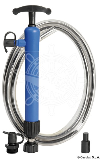 Эта помпа предназначена для всасывания масла и других жидкостей из моторных отсеков или трюмов на яхте. Она оснащена полиамидным шлангом, который устанавливается на место щупа уровня масла, и выпускным шлангом для удобства слива жидкости.